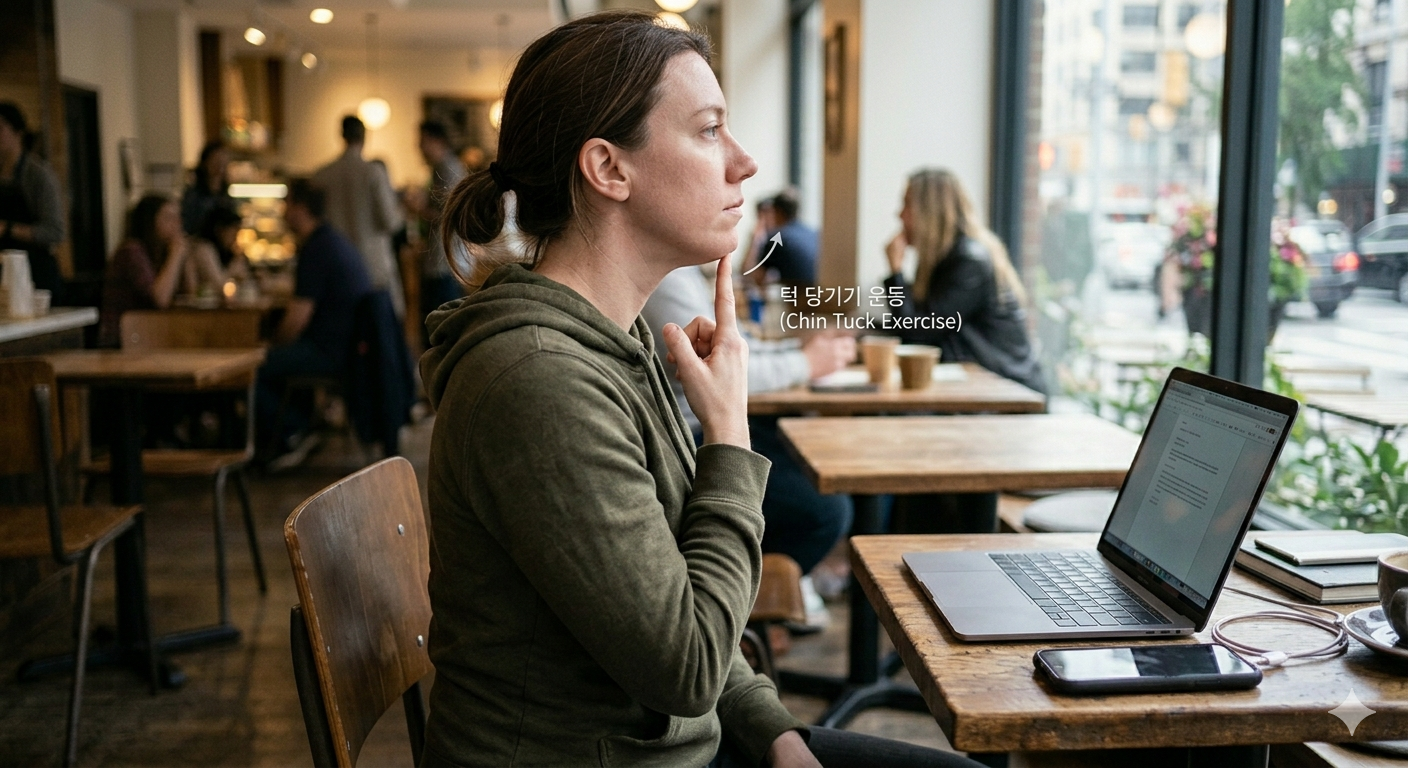 거북목 교정 스트레칭 루틴의 핵심 중 하나는 바로 턱 당기기(Chin Tuck) 운동입니다. 이 운동은 약해진 심부 굴곡근을 강화하고, 과도하게 긴장된 목 뒤쪽 근육을 이완시켜 경추의 C자 곡선을 회복하는 데 매우 효과적입니다.