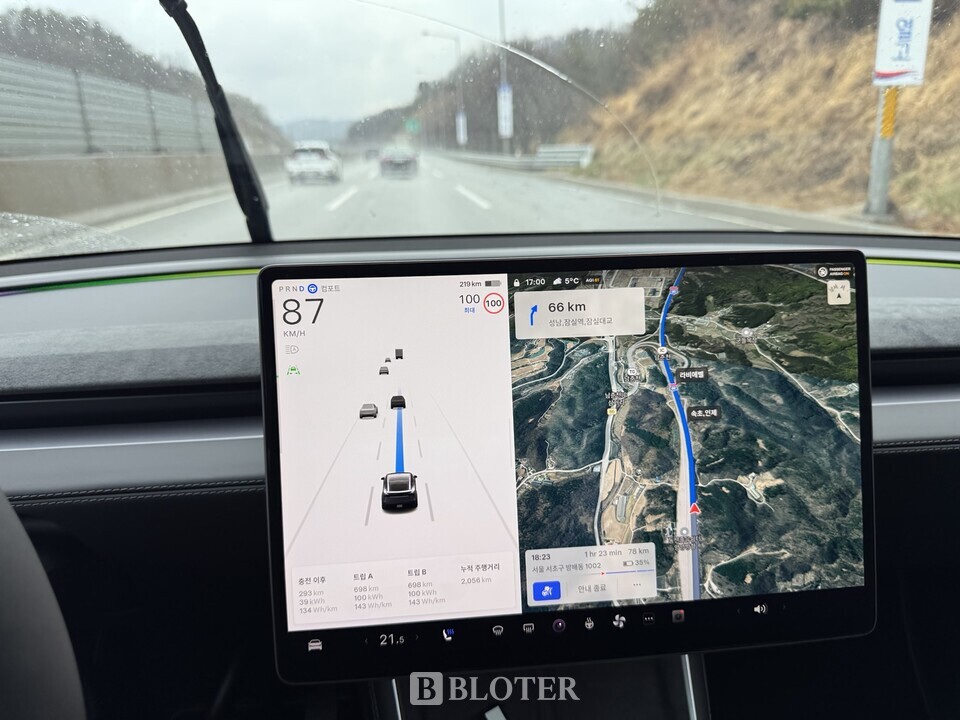주행보조 사양인 ‘내비게이트 온 오토파일럿’이 작동되고 있는 테슬라 신형 모델Y/ 출처 : bloter 사진=조재환 기자