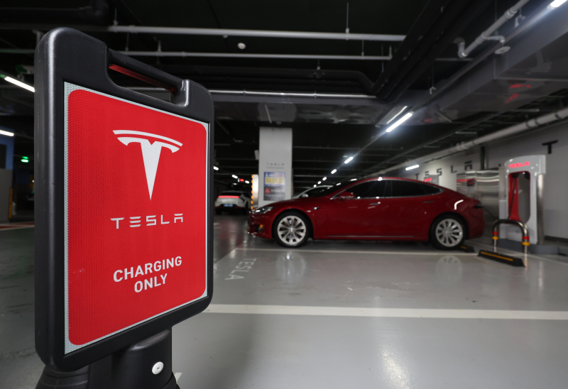 서울 시내 한 테슬라 충전소에 전기차들이 주차돼 있다. [사진 연합뉴스]