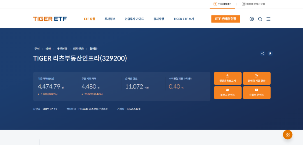 미레에셋 TIGER 리츠 ETF 홈페이지 메인 화면