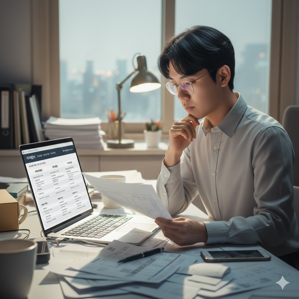 사업 소득 서류를 정리하며 마이너스통장 조건을 확인하는 자영업자