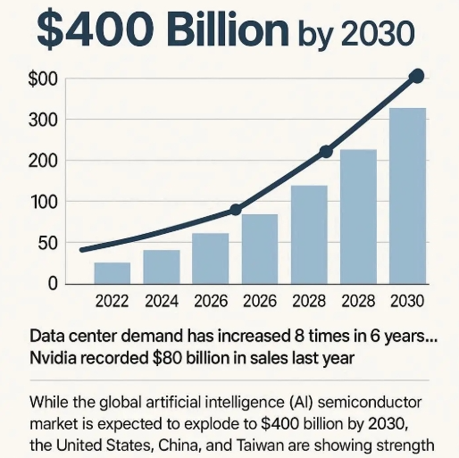 전 세계 인공지능(AI) 반도체 시장이 2030년까지 4000억 달러(약 559조 6000억 원) 규모로 폭발적 성장할 전망인 가운데, 미국·중국·대만이 각각 설계·자립·제조 분야에서 치열한 패권 경쟁을 벌이고 있다. 이미지=GPT4o