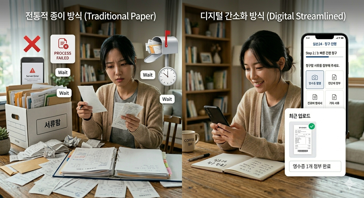 기존의 종이 서류와 대비되는 간소화된 청구 방식을 보여주는 비교 이미지