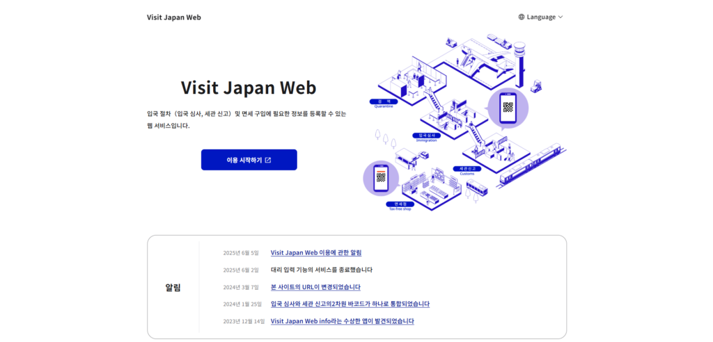 - 비짓재팬웹 (Visit Japan Web): 일본 디지털청이 운영하는 입국 및 세관 신고 사전 등록 서비스입니다. 코로나19 이후 입국 절차를 간소화하기 위해 도입되었으며, QR코드를 통해 공항 입국 심사와 세관 신고를 빠르게 처리할 수 있도록 돕습니다. 즉, 비짓재팬웹은 일본 입국을 위한 필수 절차라고 할 수 있습니다.