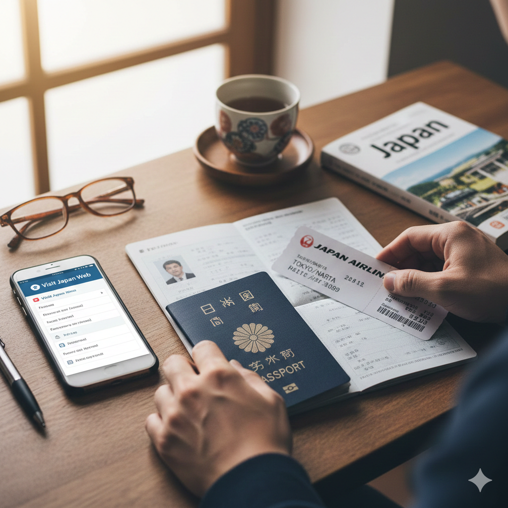 Visit Japan Web 등록을 위해 여권과 항공권을 준비하는 모습