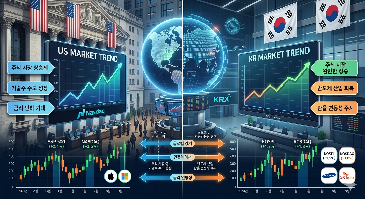 미국과 한국의 금융 시장 동향을 비교하는 모습