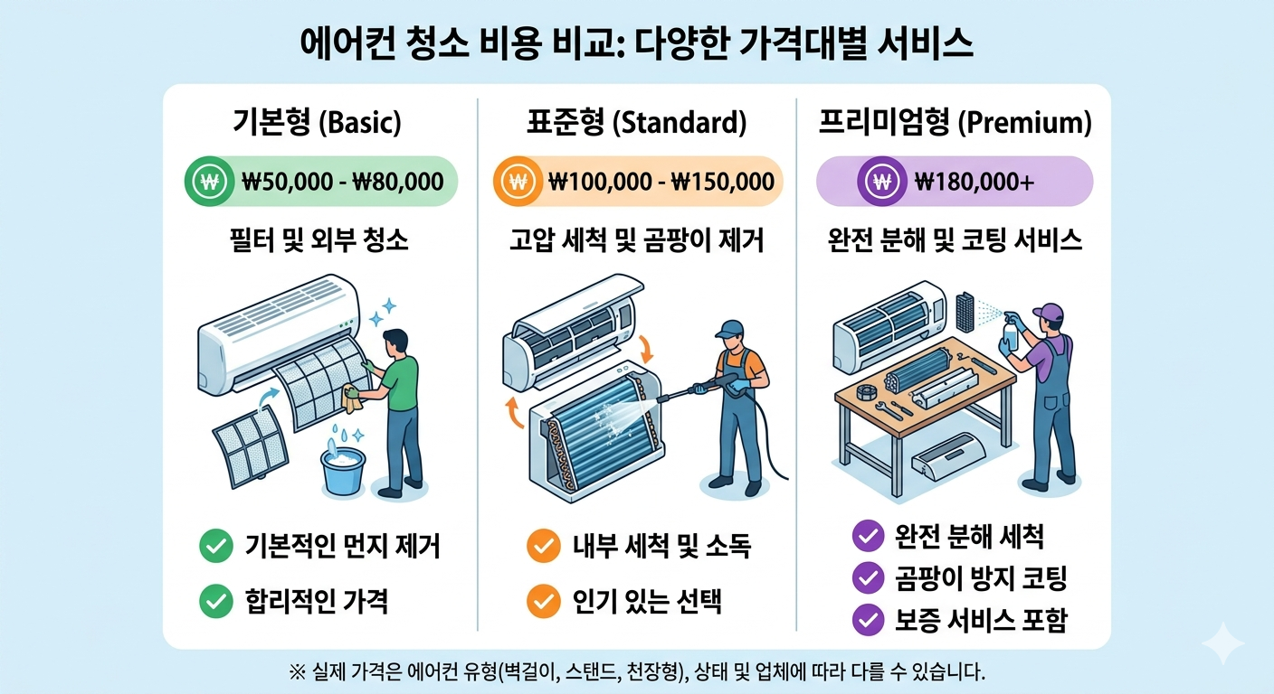 다양한 가격대의 에어컨 청소 비용을 비교하는 모습