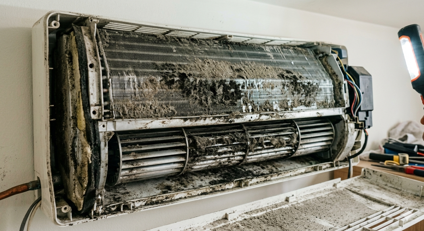 에어컨 내부에 쌓인 먼지와 곰팡이를 보여주는 모습