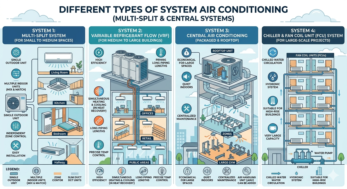 다양한 시스템 에어컨 타입을 설명하는 인포그래픽