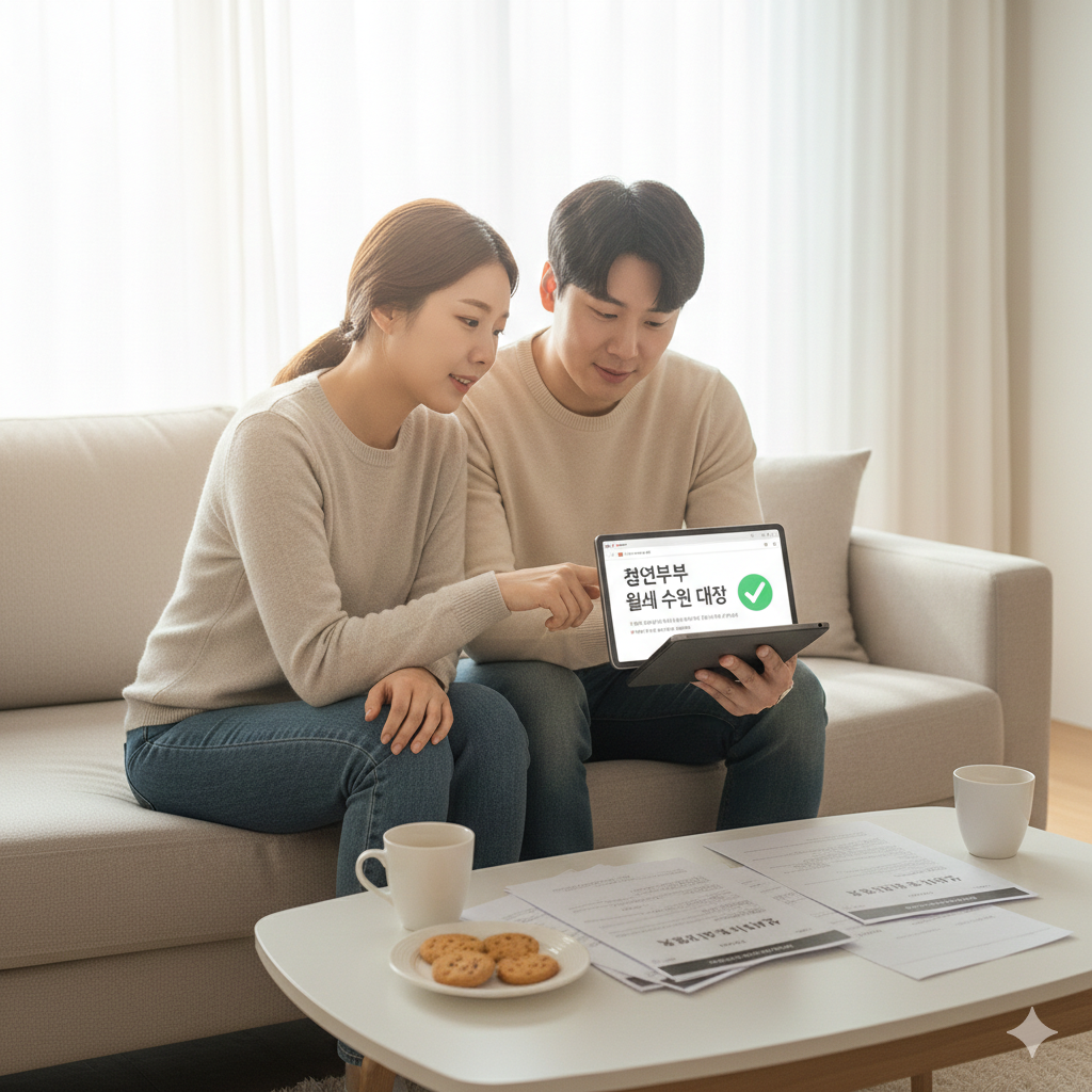 월세 지원 정보를 확인하며 안도하는 청년 부부