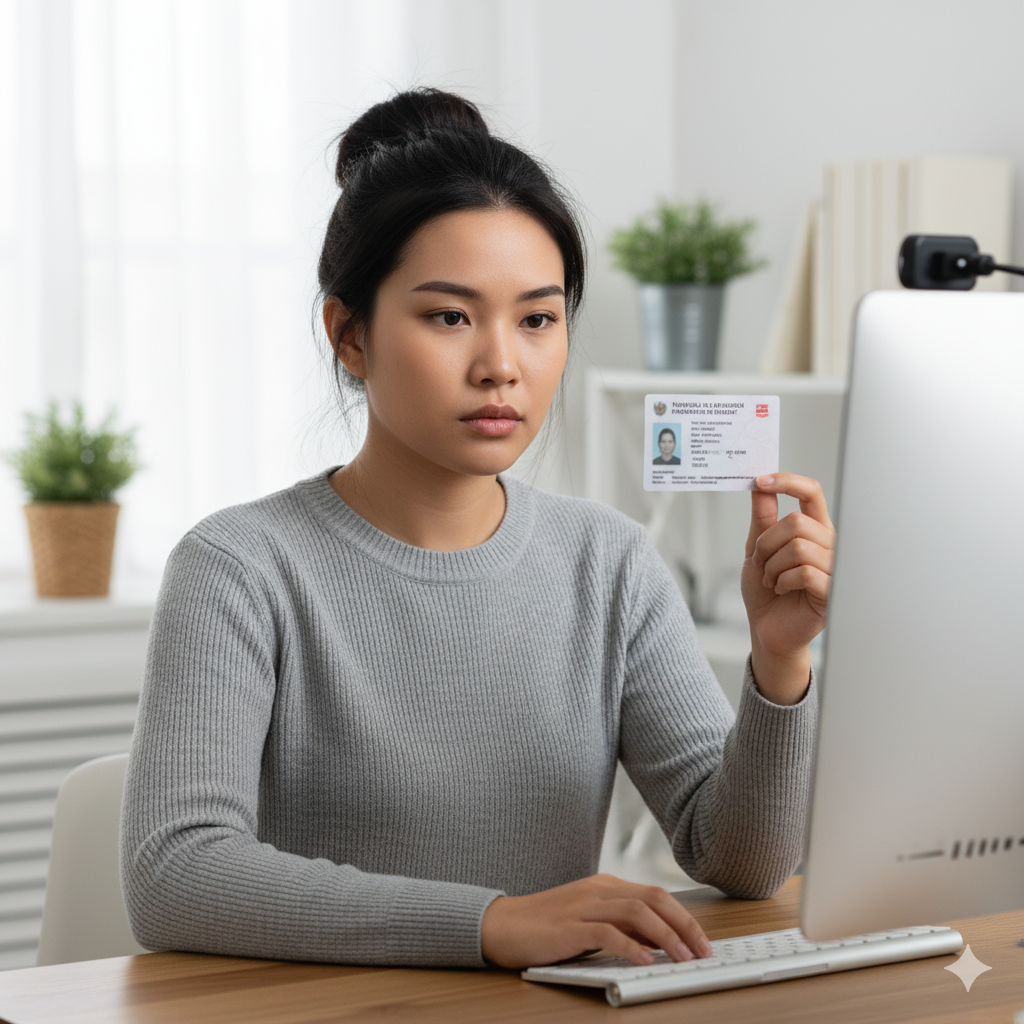 신분증을 들고 웹캠을 보는 여성