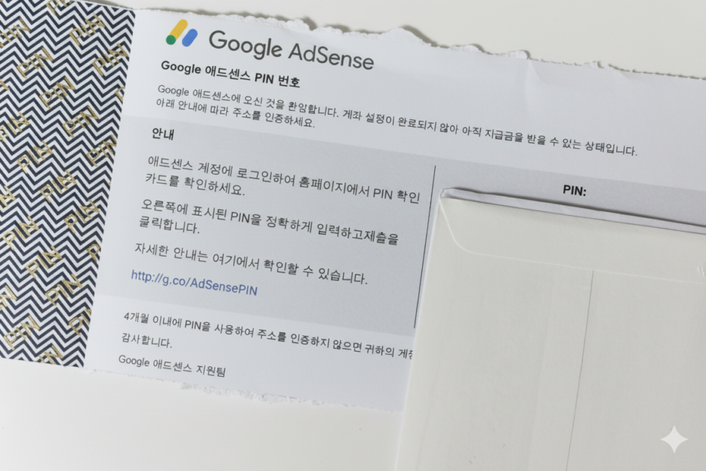 드디어 PIN 우편을 받으셨군요! 🎉 우편물은 엽서처럼 생겼고, 그 안에 6자리의 숫자 PIN 번호가 적혀 있을 것입니다. 이제 이 번호를 애드센스 계정에 입력해 주시면 됩니다.