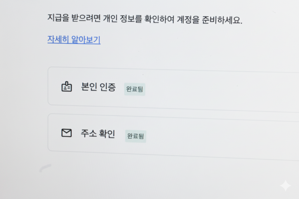 모든 절차가 정상적으로 완료되면, “주소 확인 완료”라는 메시지가 보일 것입니다. 그리고 홈 화면에 계속 나타나던 “주소가 확인되지 않아 지급이 보류 중입니다”라는 메시지도 사라지게 됩니다. 이제 한시름 놓으셔도 좋습니다.