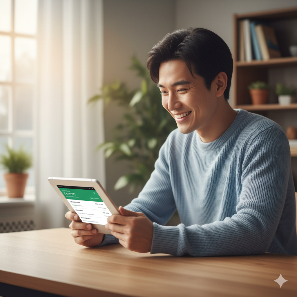 은행 계좌를 확인하며 미소 짓는 한국인