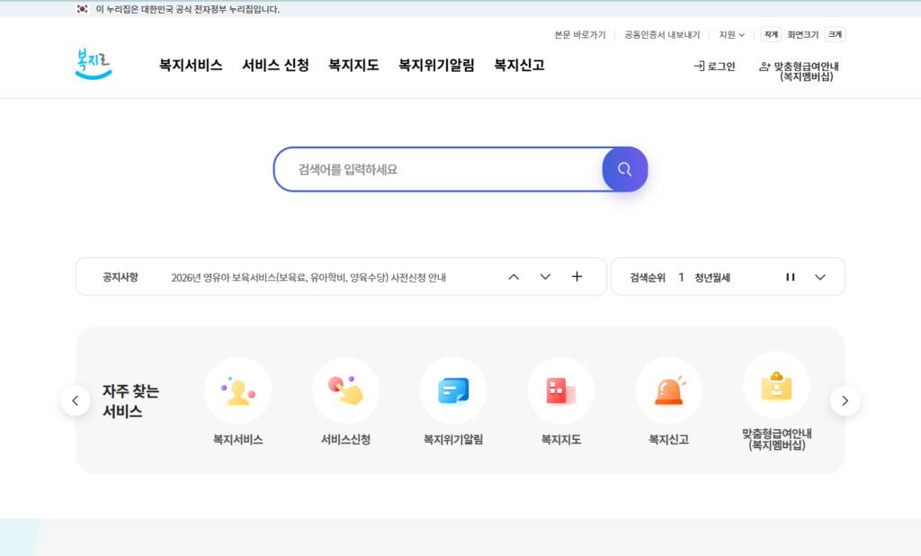 복지로 홈페이지 메인 화면