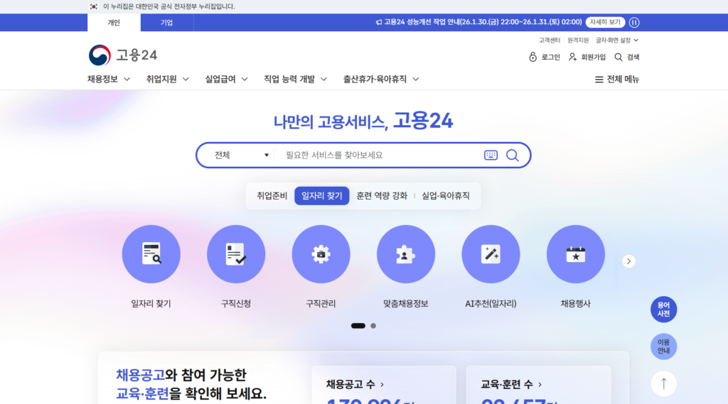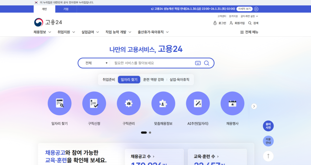 고용24 홈페이지 메인 화면