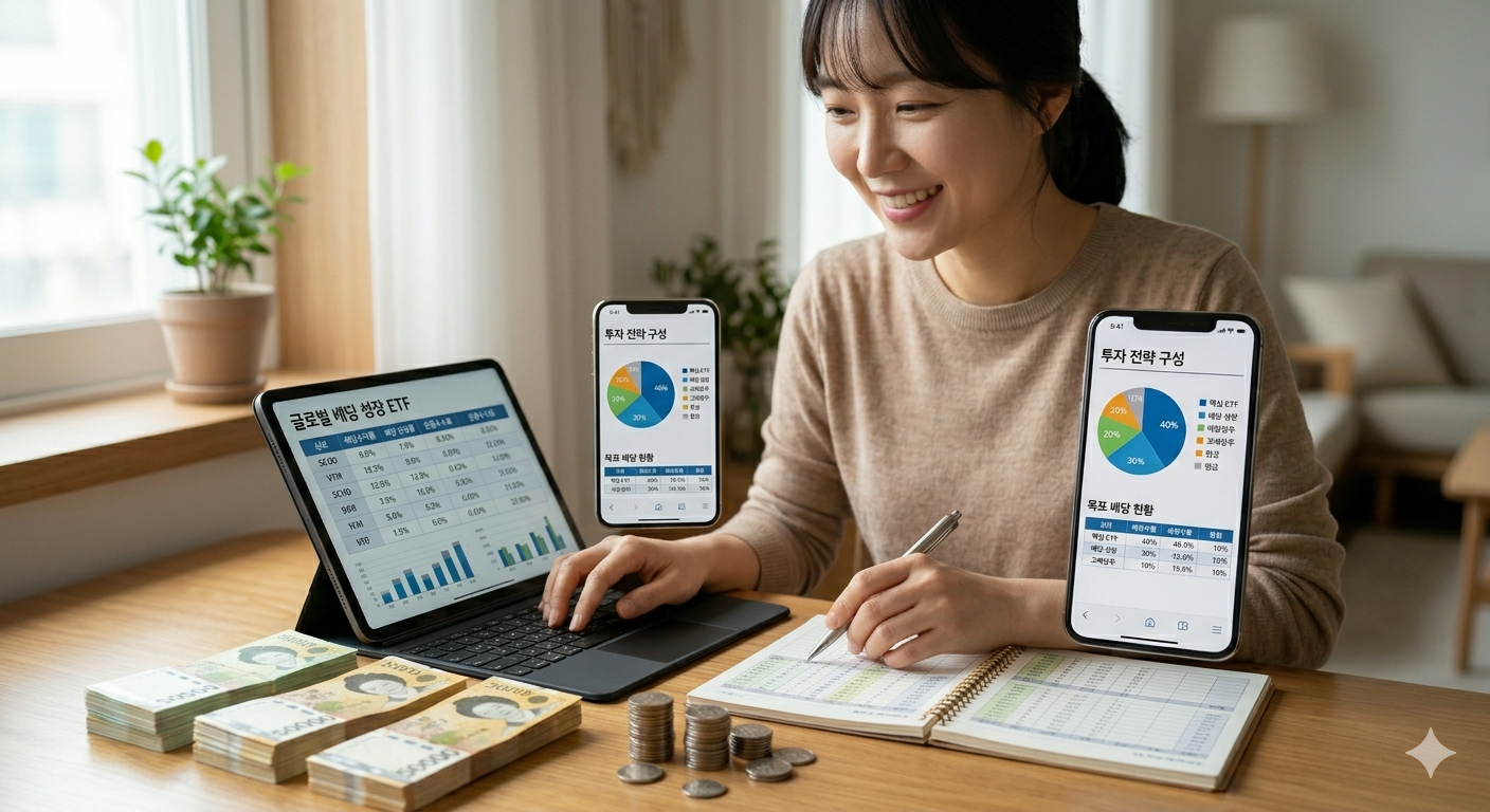 배당금과 ETF를 보며 투자 전략을 세우는 모습
