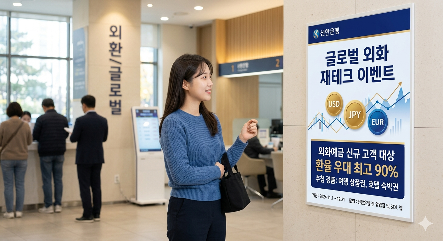 신한은행은 2026년 1월 26일부터 2월 25일까지 ‘외화체인지업 예금 90% 환율우대’ 이벤트를 진행했습니다. 이처럼 특정 기간에 진행되는 이벤트는 환율 우대 100에 가까운 혜택을 받을 수 있는 좋은 기회가 됩니다. 달러를 원화로 환전하는 고객에게 90%의 우대율을 적용하고, 원화 정기예금 가입 시 0.1%포인트의 우대금리까지 추가로 제공했습니다. 온라인 송금 시에는 추가 10% 우대가 가능하여 더욱 유리했습니다.
