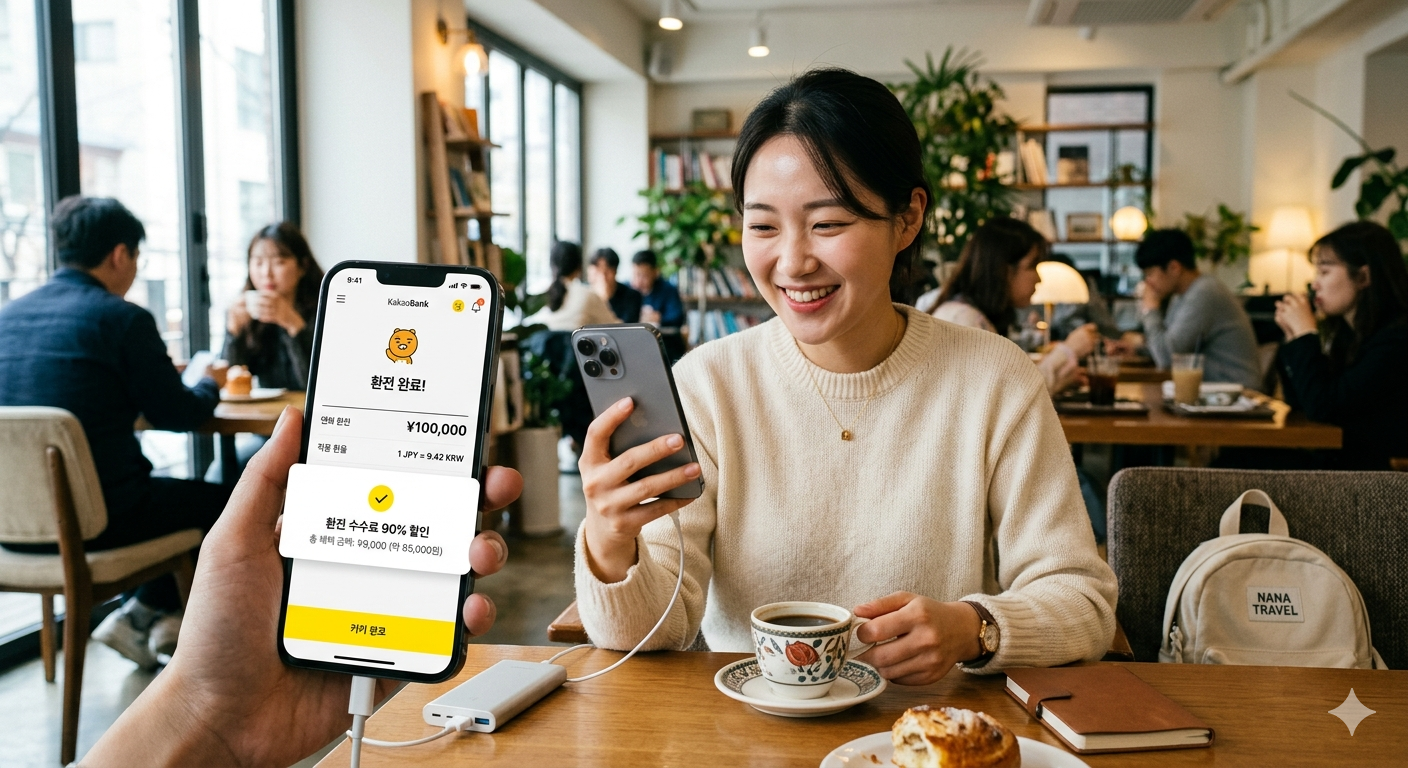 인터넷은행 앱을 통해 환전 수수료 혜택을 받는 모습