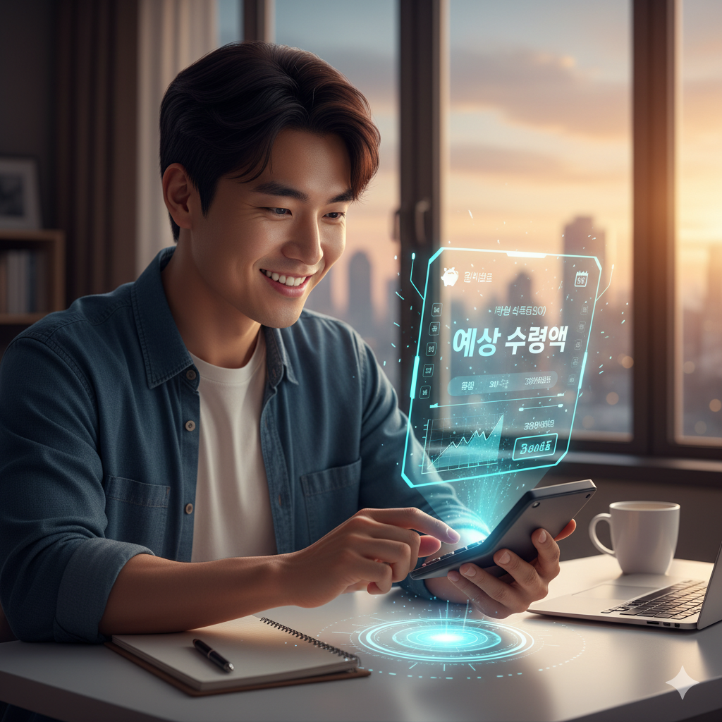청년이 계산기를 두드리며 예상 수령액을 확인하는 모습