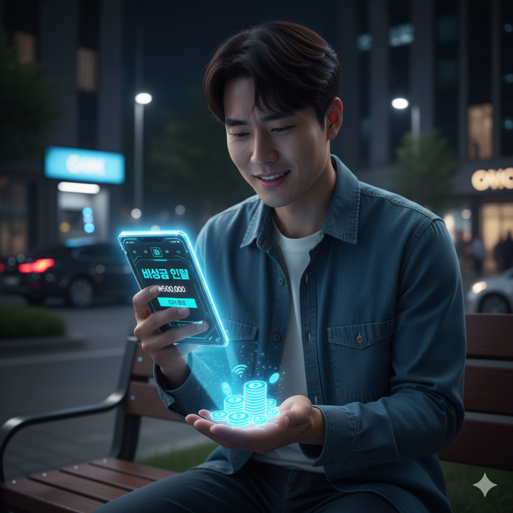 청년이 급한 자금을 스마트폰으로 인출하는 모습