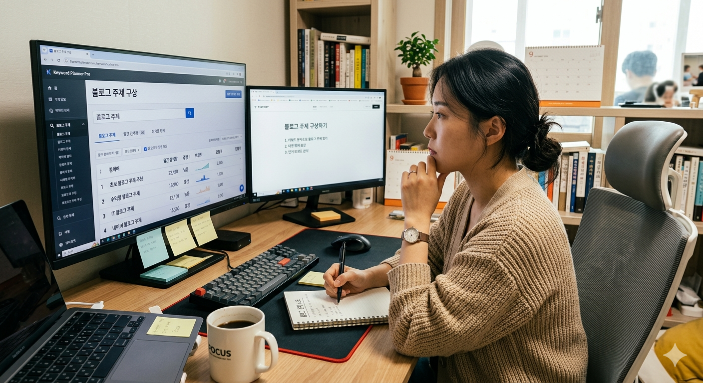 키워드 분석 도구로 블로그 주제를 구상하는 모습