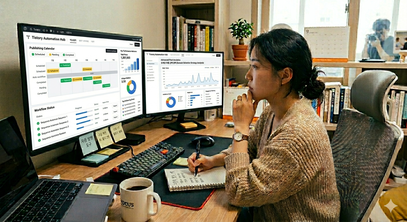 자동화된 블로그 발행과 분석 데이터를 모니터링하는 모습