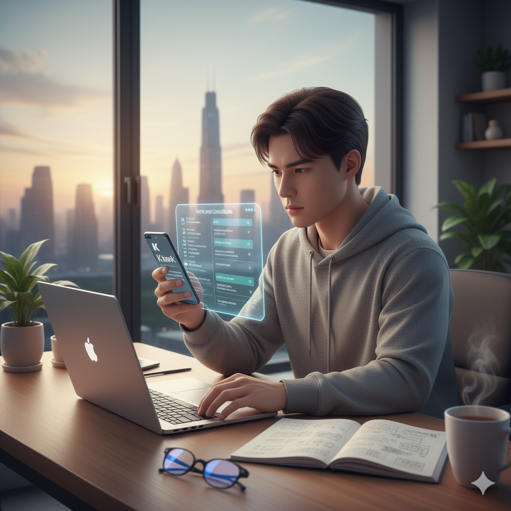 스마트폰으로 케이뱅크 앱을 사용하며 주의사항을 확인하는 모습