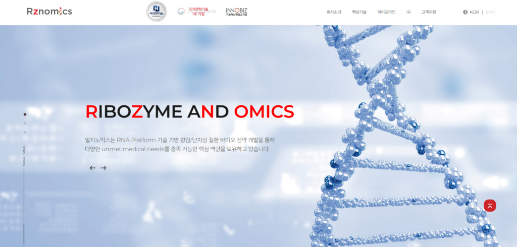 알지노믹스는 2017년에 문을 연 회사로, 우리 몸의 RNA 기반 유전자 치료제를 전문적으로 만듭니다. 암과 같이 치료하기 어려운 질병들을 고치는 약을 개발하는 것이 주된 목표입니다.