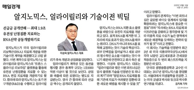 5/16일(목) 매일경제는 알지노믹스와 글로벌 톱 티어 제약회사 美 일라이릴리와의 기술이전 체결 소식을 보도했다.