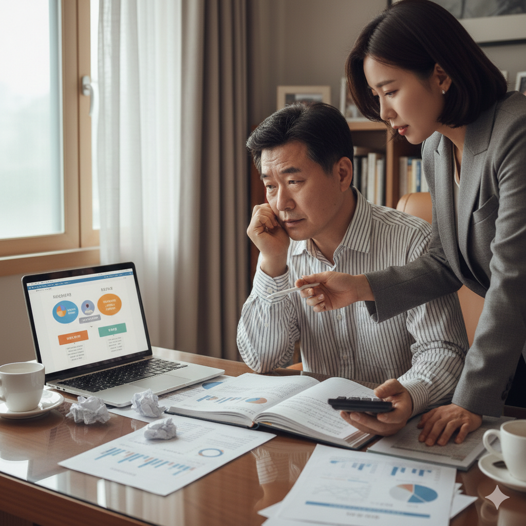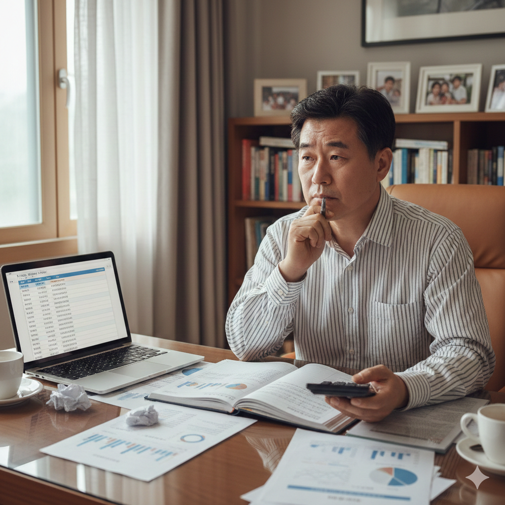 재정 계획에 대해 걱정하는 한국인 남성