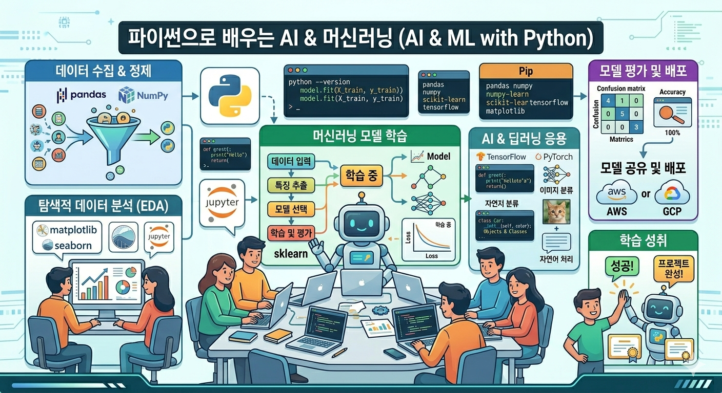 2026년의 AI/ML 패러다임은 데이터 문해력과 자율 AI 에이전트 개발에 초점을 맞추고 있습니다. 파이썬을 기반으로 한 AI 강좌를 수강하거나, 바이브코딩 기초와 같은 입문 과정을 통해 기본적인 개념과 활용법을 익히는 것이 좋습니다. 무엇보다 가독성과 프로토타이핑 능력을 강조하는 학습이 중요합니다.
