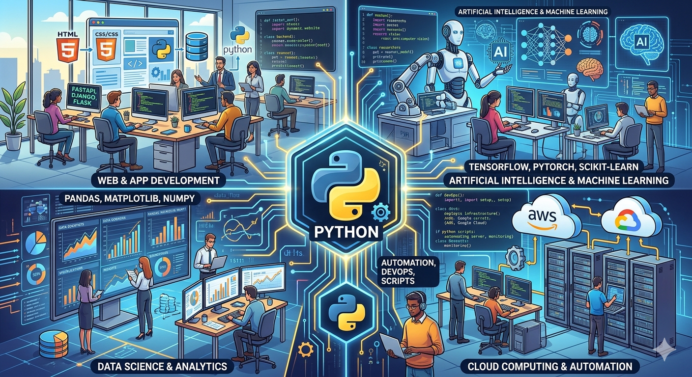 다양한 분야에서 활용되는 파이썬의 모습을 보여주는 이미지