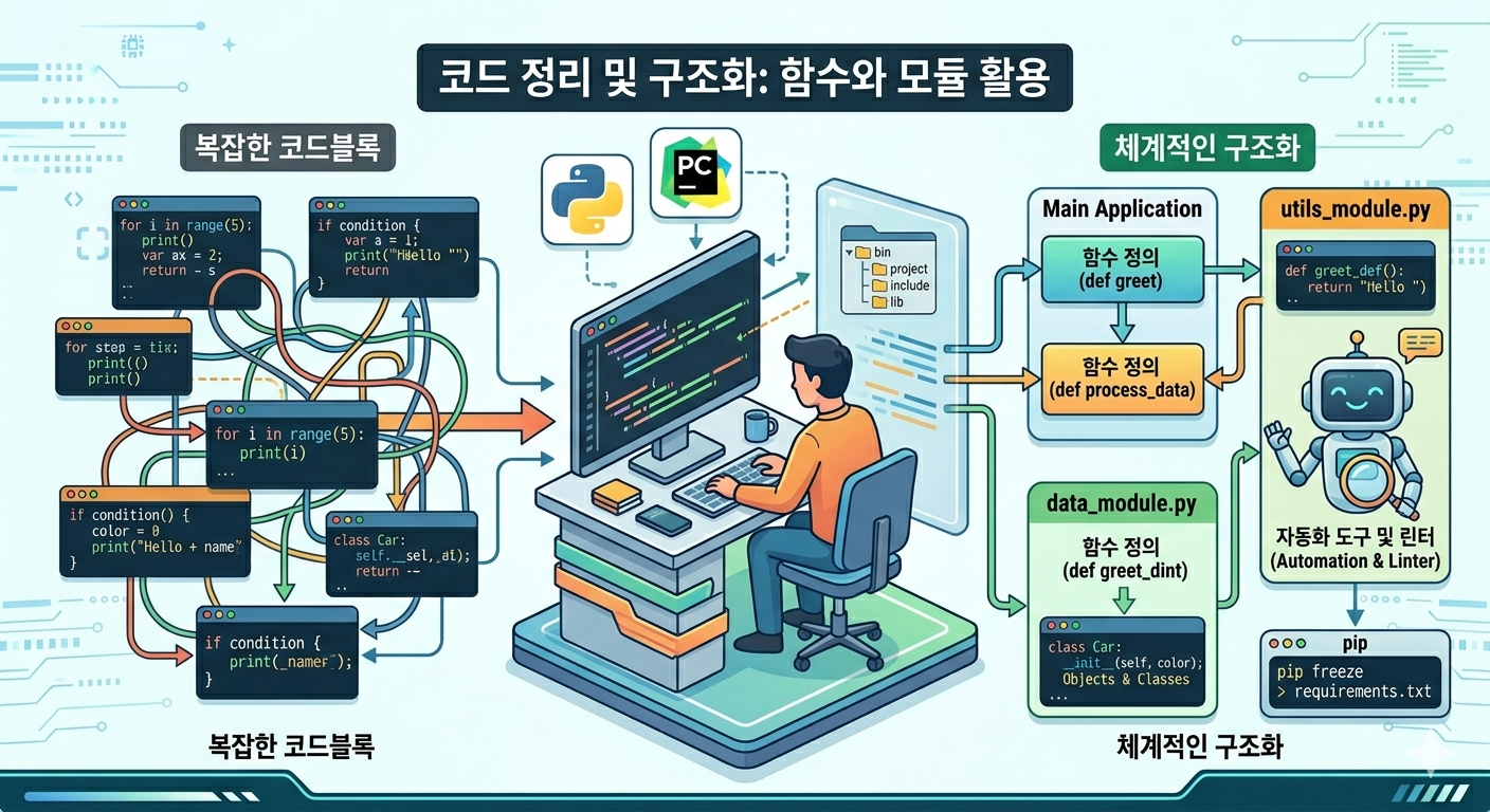 함수와 모듈을 사용하여 코드를 정리하는 모습을 나타내는 이미지