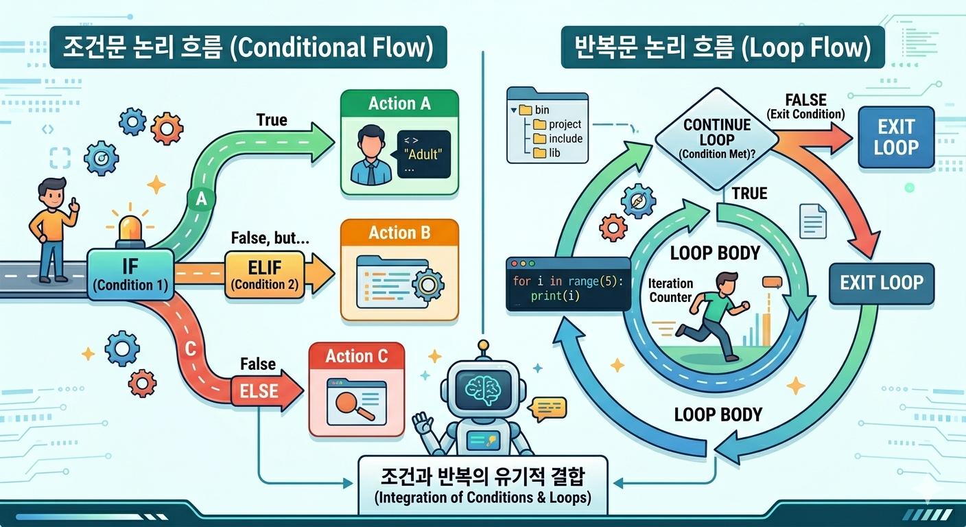이제 파이썬으로 조금 더 복잡한 로직을 만들어 볼 차례입니다. 조건문(If/Else)과 반복문(For/While)은 컴퓨터가 특정 조건을 판단하고, 정해진 작업을 여러 번 수행하게 만드는 핵심 도구입니다. 이 두 가지를 잘 활용하면 다양한 문제를 해결할 수 있습니다.