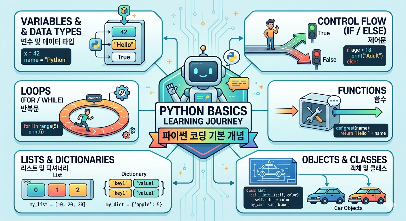파이썬 코딩의 기본 개념들을 시각적으로 표현하는 이미지