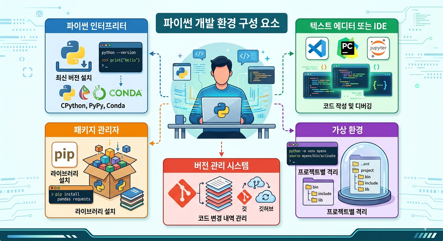 파이썬 개발 환경을 설정하는 데 필요한 요소들을 보여주는 이미지