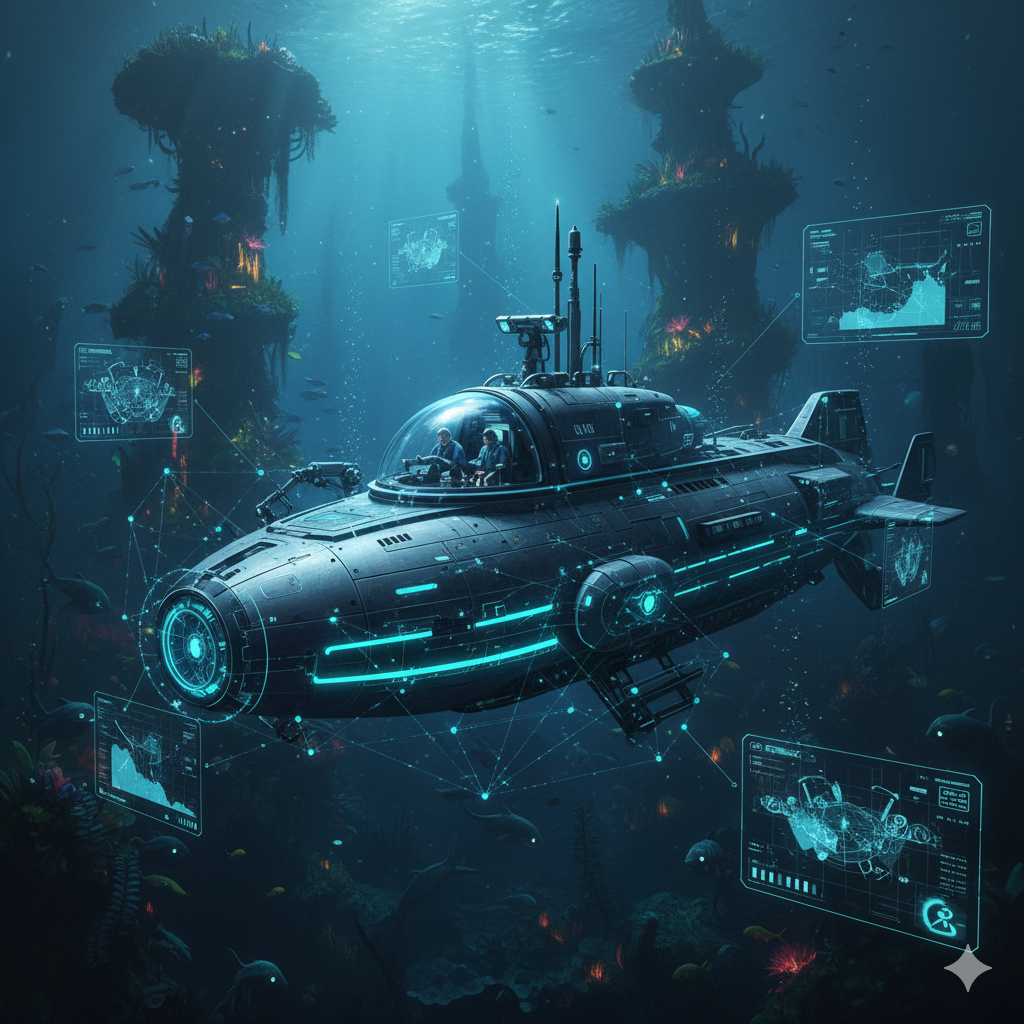 첨단 기술로 심해를 누비는 잠수함의 중요성을 보여주는 이미지입니다.