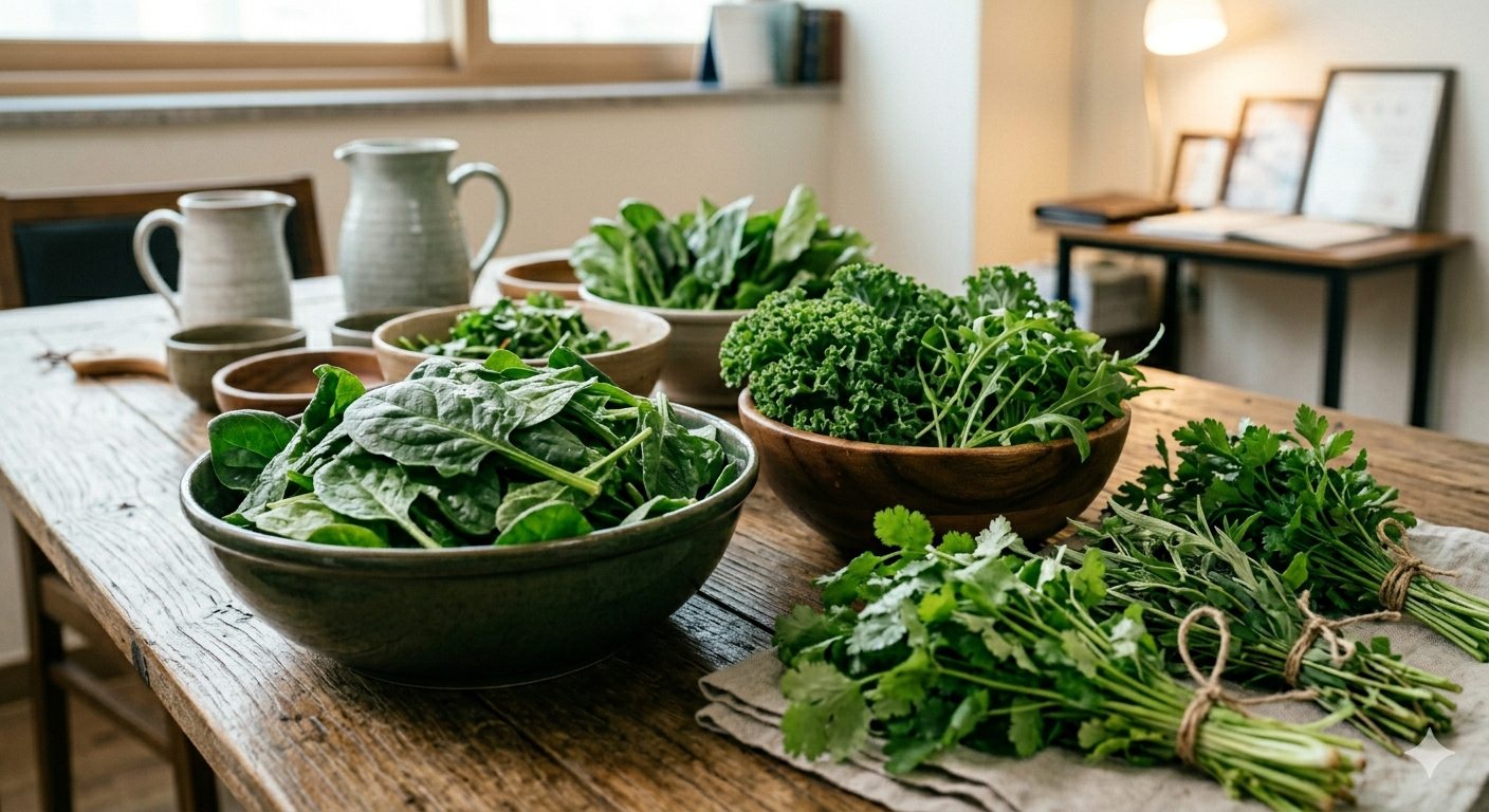 녹색 잎채소들이 식탁에 놓여있는 모습