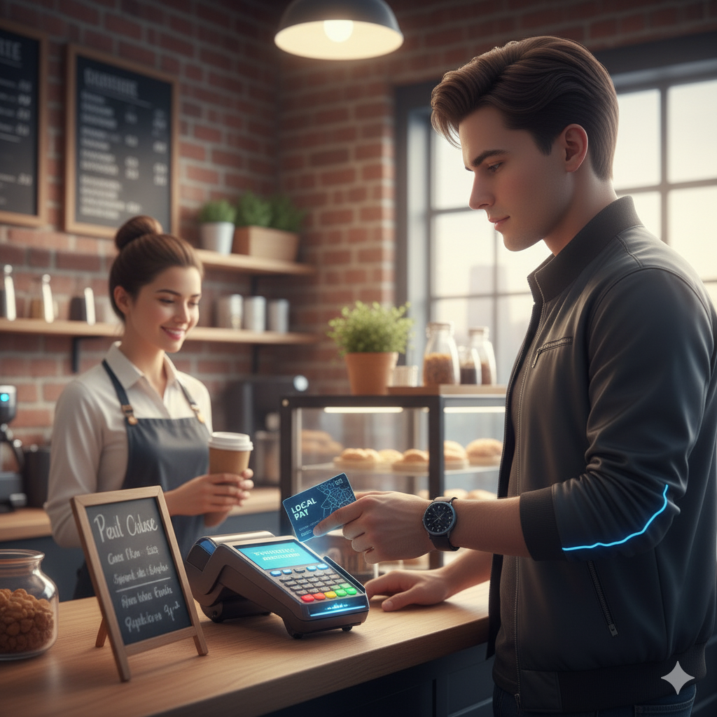 지역화폐 카드를 사용하는 청년의 모습을 담은 이미지입니다.