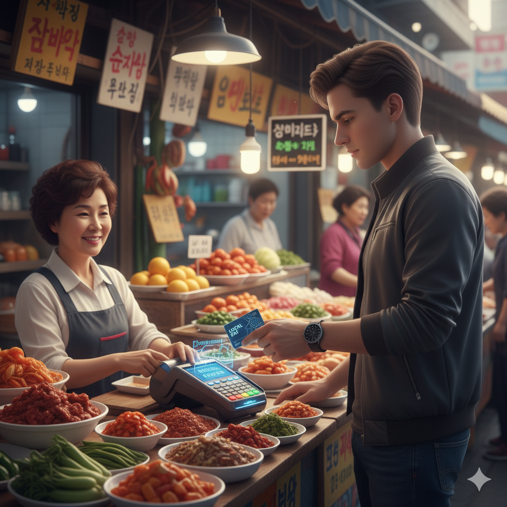전통시장에서 지역화폐를 사용하는 청년의 모습을 담은 이미지입니다.