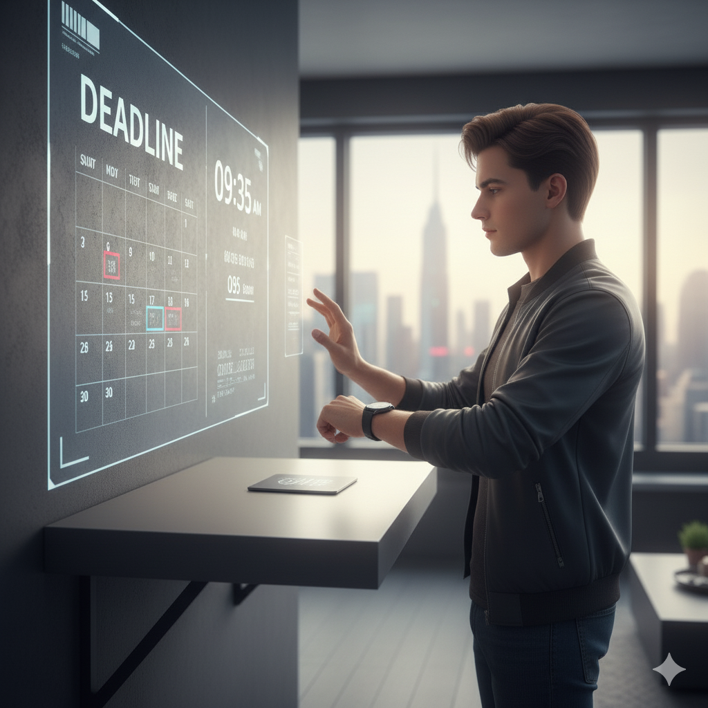 달력과 시계를 확인하는 청년의 모습을 담은 이미지입니다.