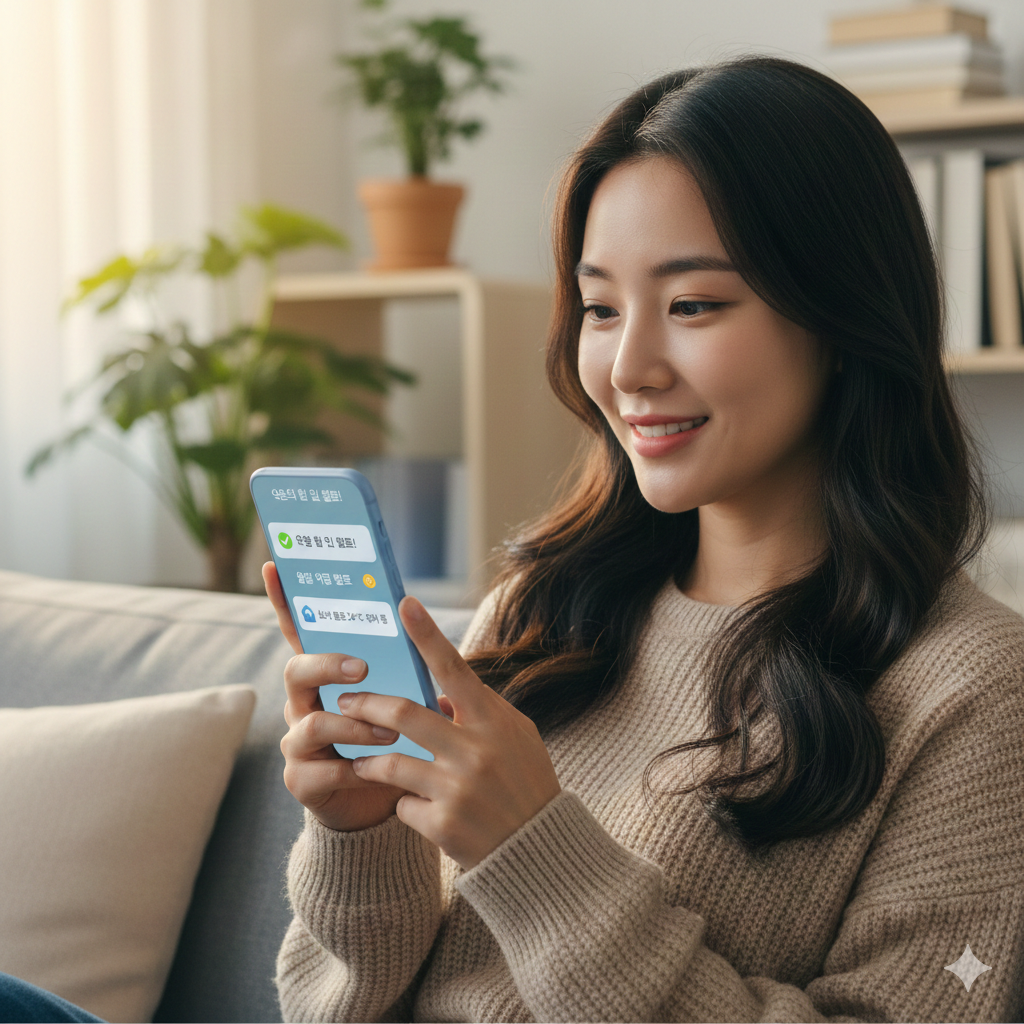 생활 관련 알림을 확인하며 미소 짓는 모습