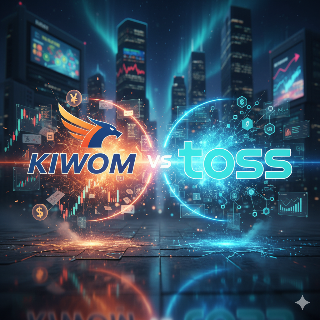 해외주식 시장에서 키움증권과 토스증권의 치열한 경쟁 구도를 상징하는 이미지입니다.