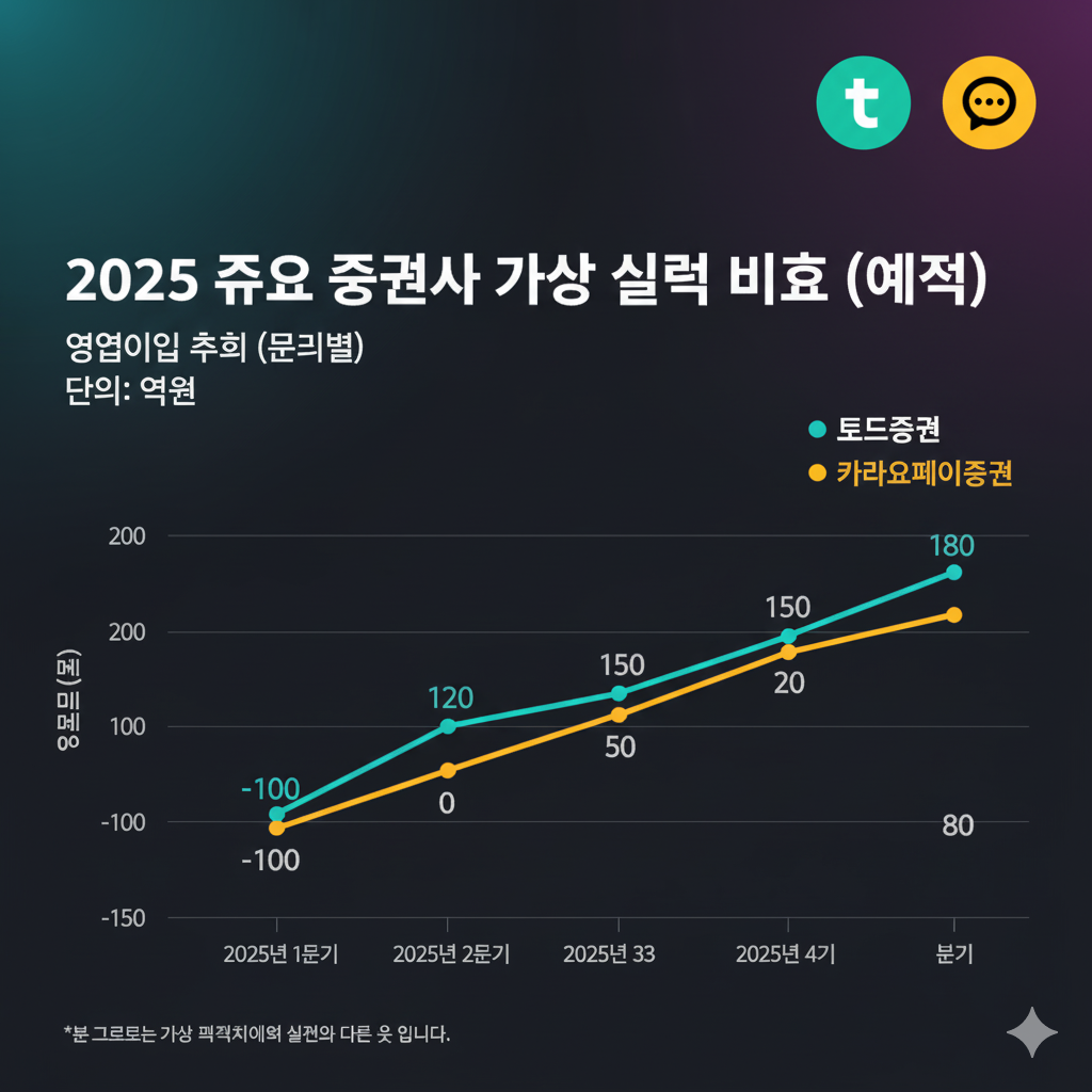 토스증권과 카카오페이증권의 실적 격차를 시각적으로 비교하는 그래프 이미지입니다.