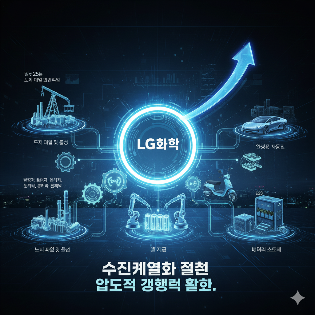 LG화학이 2차전지 소재부터 배터리 생산까지 수직계열화를 통해 강력한 경쟁력을 갖춘 모습을 시각적으로 표현한 사진입니다.