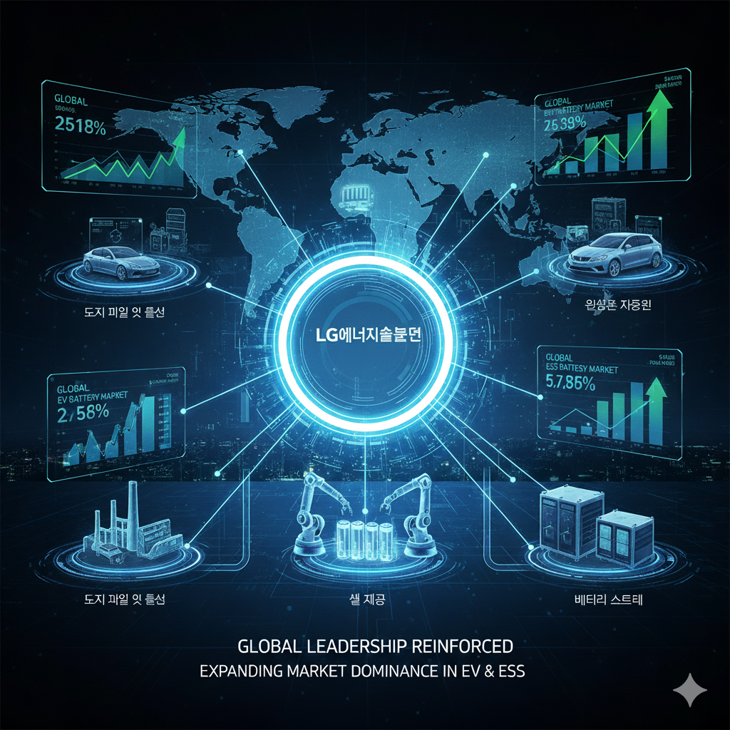 LG에너지솔루션이 전 세계 전기차 및 ESS 배터리 시장에서 점유율을 확대하며 글로벌 리더십을 강화하는 모습을 보여주는 사진입니다.
