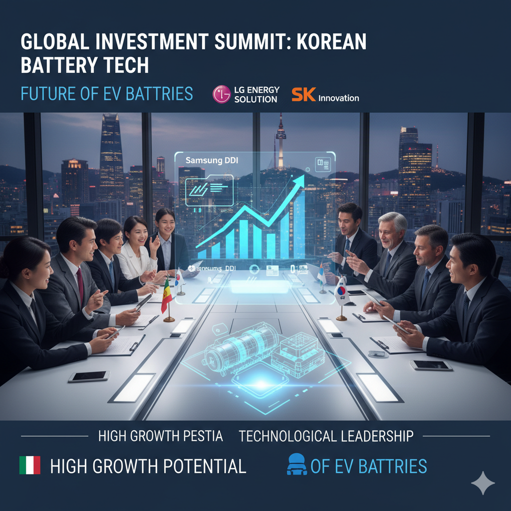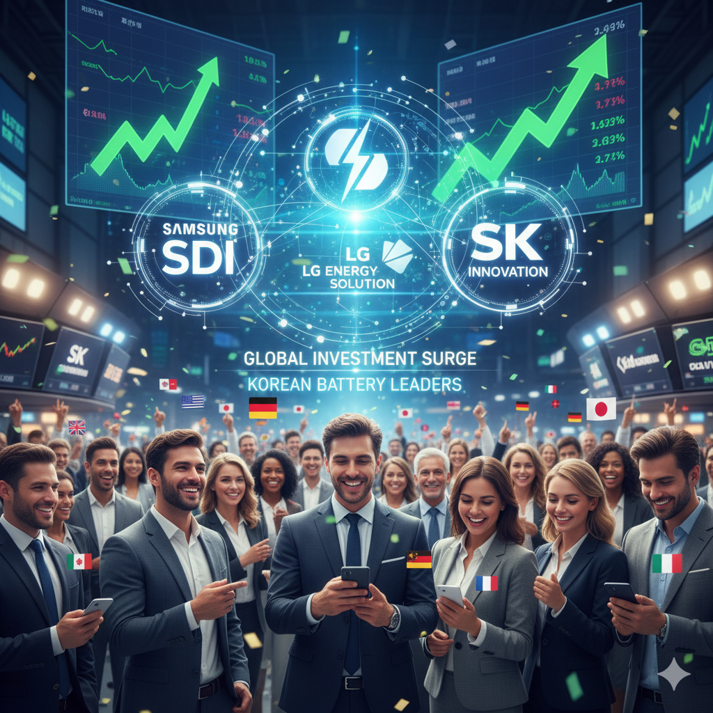 전 세계 투자자들이 한국 2차전지 기업들의 성장 가능성과 기술 경쟁력을 높이 평가하며 투자하는 모습을 표현한 사진입니다.