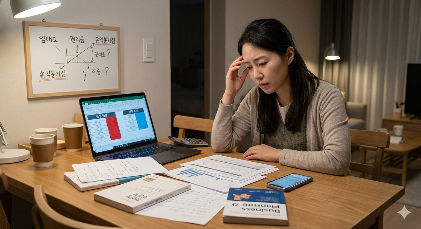 창업 비용과 예상 수익을 분석하며 고민하는 모습
