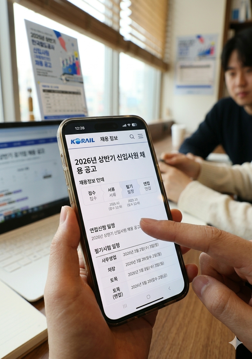 코레일 로고와 함께 채용 공고를 확인하는 모습